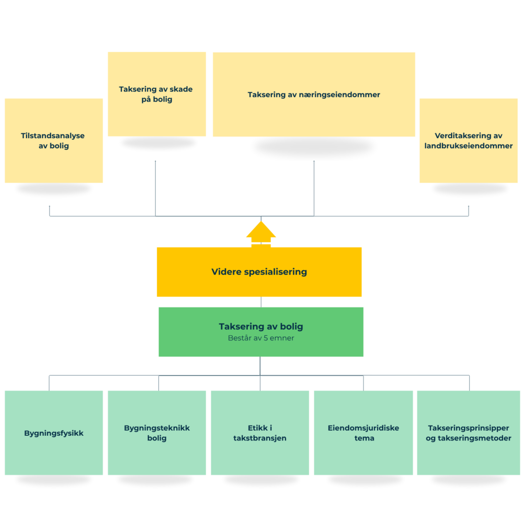 Når du har det faglige grunnlaget på plass, kan du gå videre mot den spesialiseringen som passer best for din rolle og dine oppdrag. Videre løp kan for eksempel være knyttet til næringseiendom, landbruk, skade eller tilstandsanalyse. Den nye modellen skal gjøre det tydeligere hvilke emner som danner fundamentet før du går videre.